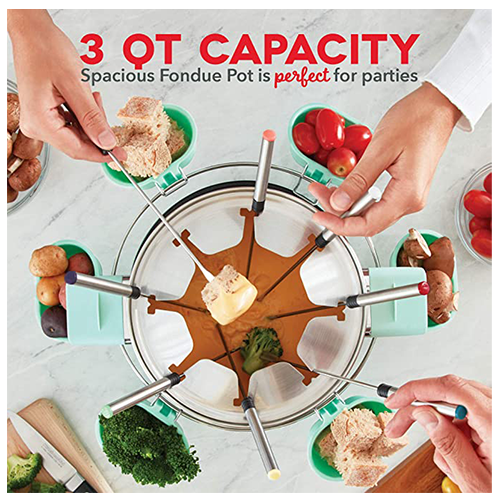 Make delicious fondue at home with the Dash Deluxe Fondue Maker! Perfect for cheese, chocolate, and oil fondue, the Fondue Maker melts ingredients to the perfect temperature for decadent fondue entertaining. Use the 8 color-coded Fondue Forks to enjoy with friends and family, and the convenient Fork Rack on top of the Fondue Maker helps prevent drips. Plus, with the added Fondue Cups around the edge, you can serve up your favorite fruits, veggies, meats, and more, all conveniently located around the Stainless Steel Fondue Pot. Our included Recipe Guide will get you started wowing friends and family with your own homemade fondue!